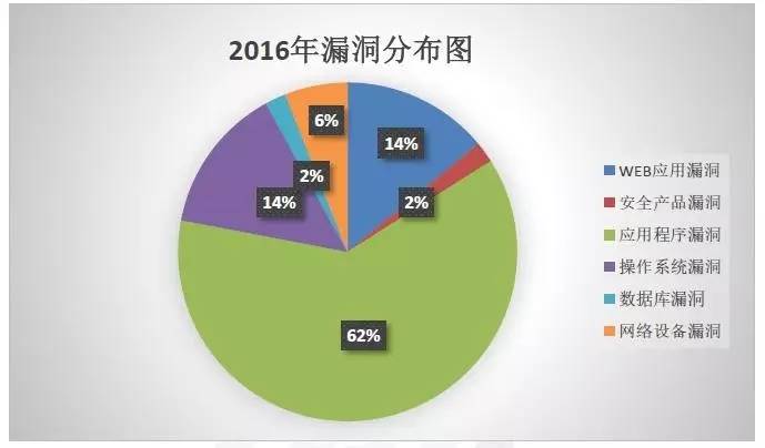 截至2016 年12 月,据统计,中国国家信息安全漏洞库(CNNVD)新增漏洞8870 个,国家信息安全漏洞平台(CNVD)新增漏洞10281 个,均比去年同期有明显增长。CNVD 收录的2016 年的漏洞数据显示,漏洞类型主要有:Web 应用漏洞、安全产品漏洞、应用程序漏洞、操作系统漏洞、数据库漏洞、网络设备漏洞等。其中应用程序漏洞比重最大,如图,高达62%。