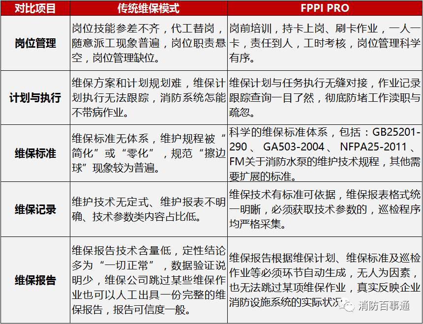 当前消防系统维修保养行业鱼龙混杂,消防设施隐患重重,迫切需要市场规范,技术革新。应运而生的 “互联网+”的FPPI PRO消防设施维修保养数据管理系统正是解决之道。下表是传统维保模式和FPPI PRO的对比。