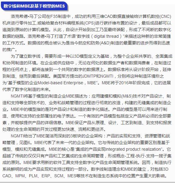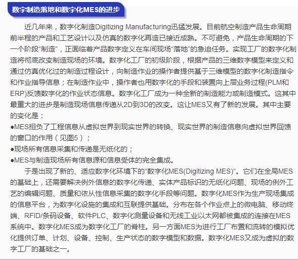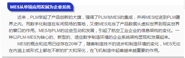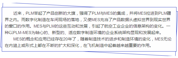 MES的发展和因MES引发的企业信息架构的变化给我们描绘出了以PLM—MES为轴心的新的企业架构的愿景。了解当前制造企业架构的发展趋向,给我们以严重的启示:旧的信息架构和信息化规划的方式已经不能适应数字化制造时代的要求了;也使我们察觉出我们企业差距之大。当前,几乎所有的航空制造企业必须尽快的跳出部门的和传统的观念,以数字线的贯通为目标,及早构建以产品全生命周期(包括MES和MRO在内)为主线、资源管理为支持的新型企业架构。