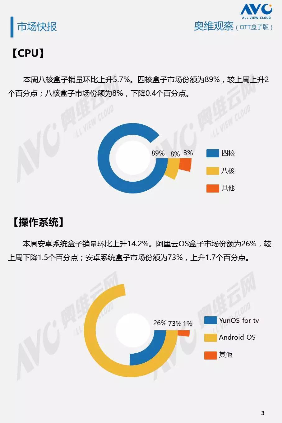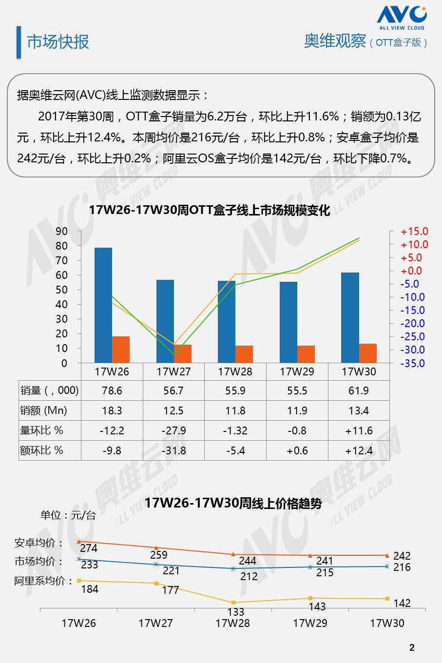 奥维云网发布第30周OTT盒子观察报告,据奥维云网(AVC)线上监测数据显示:2017年第30周,OTT盒子销量为6.2万台,环比上升11.6%;销额为0.13亿元,环比上升12.4%。本周均价是216元/台,环比上升0.8%;安卓盒子均价是242元/台,环比上升0.2%;阿里云OS盒子均价是142元/台,环比下降0.7%。