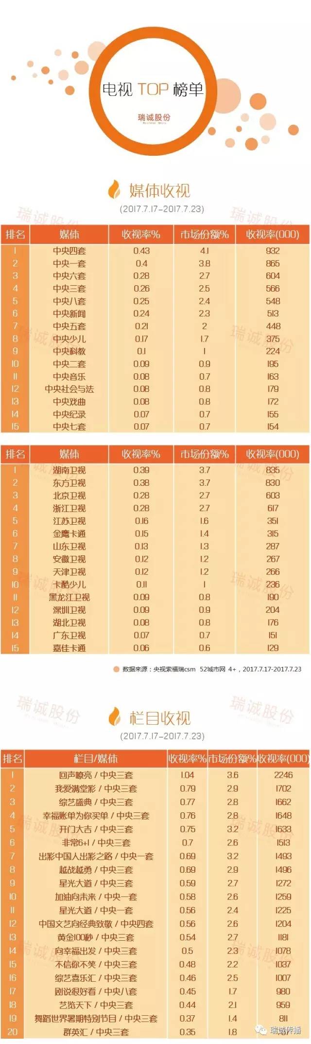 瑞诚传播公布了一周电视TOP榜单,供大家参考,详情如图: