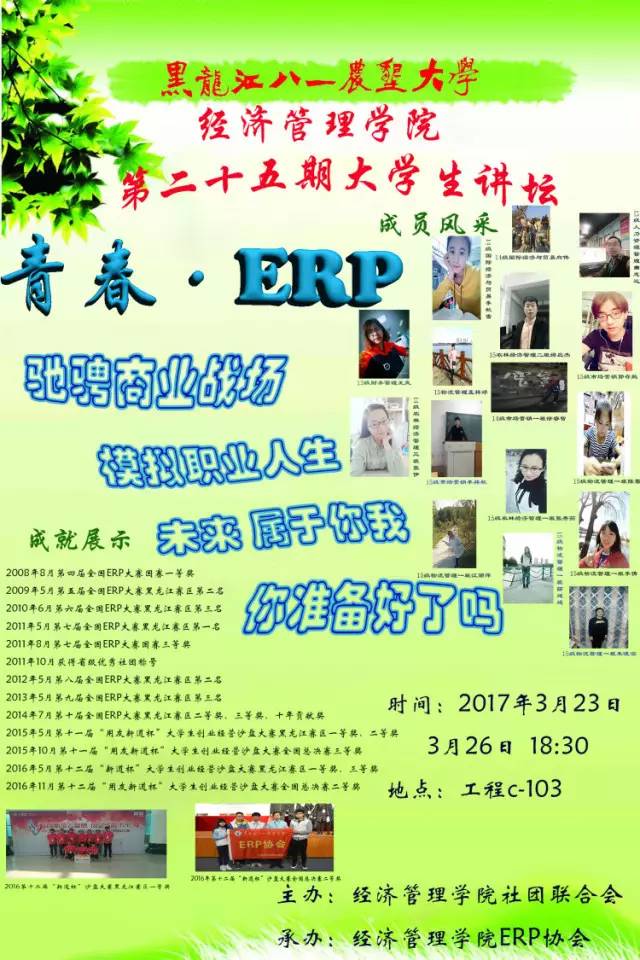为了帮助广大同学在美好的青春树立远大的目标,经济管理学院erp协会将于3月23日与3月26日在工程c-103承办以青春·ERP 为主题的大学生讲坛。