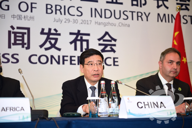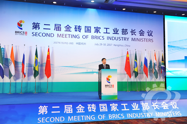 2017年7月29日,第二届金砖国家工业部长会议在浙江杭州成功举行,中国工业和信息化部部长苗圩、副部长刘利华,巴西工业、外贸和服务部副部长卡尔韦特、俄罗斯工业和贸易部副部长卡拉曼诺夫、印度商业和工业部部长助理查图维迪、南非贸易和工业部部长戴维斯和联合国工业发展组织总干事李勇以及来自金砖国家政府和企业界的120余名代表出席会议。会议围绕“新工业革命背景下制造业发展的机遇和挑战” 这一主题,就工业重点领域产业和投资、技术开发和创新合作等各国共同关注的议题进行深入探讨,会议通过了《金砖国家深化工业领域合作行动计划》,形成广泛共识。