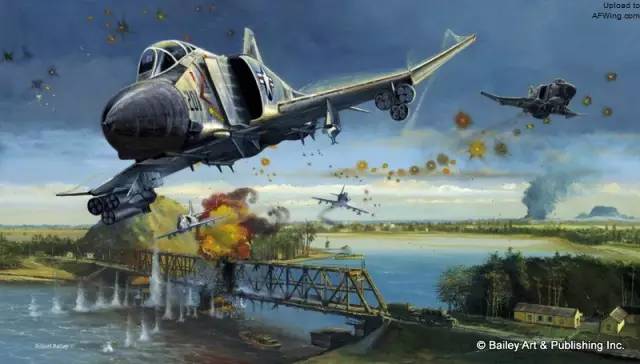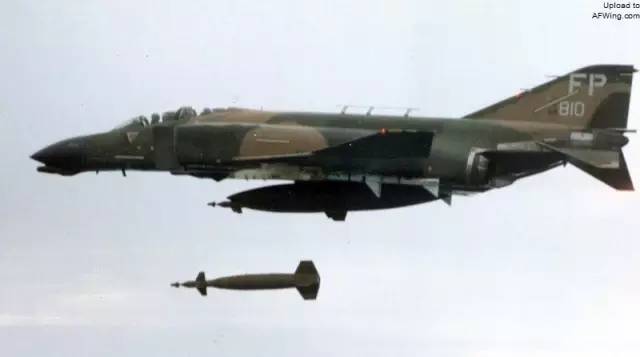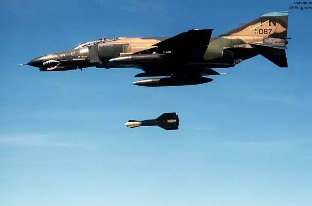 一架F-4战机正在投放一枚Mk 84激光制导炸弹。正是像这架F-4战机一样的一些挂载着精确制导武器的飞机最终炸毁了“龙之颚”大桥