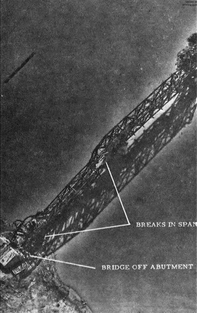 被炸毁的清化大桥的特写镜头,可见桥梁西半部的主体结构完全从混凝土墩台上被炸得塌了下来