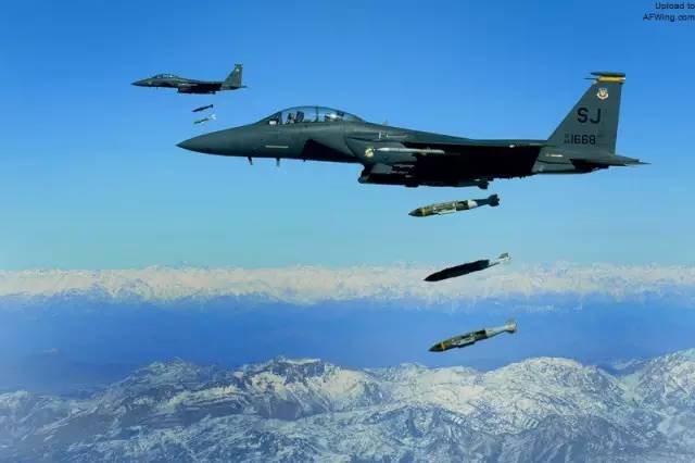 正在投放“杰达姆”制导炸弹攻击一处恐怖分子藏身洞穴的F-15E战斗机,来自第335战斗机中队