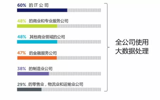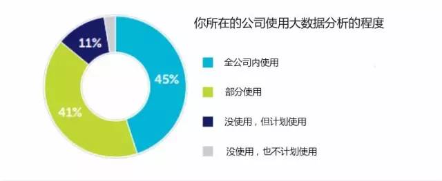 对其当前地位的战略重要性而言,大数据的优势在短时间内就显现了出来。但这一报告发现,尽管大数据分析技术相对较新却分布广泛,86% 的公司已经使用某种形式的大数据分析了。其中,45% 在全公司内使用大数据,41% 部分使用。剩下的还未开始使用大数据的公司中,有11% 计划在未来使用大数据。信息:大数据将很快在全球每一组织的运行中起作用。