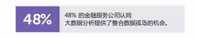 48% 的金融服务公司认同大数据分析提供了整合数据孤岛的机会。在情理之中的是,与金融世界最紧密相连的公司将大数据视为优先事项。根据 Gartner 的报道(「数据质量现状:现行的做法和发展趋势」),低质量的数据每年让公司付出 1420 万美元。财务报表上不可能存在该对这种级别的损失负责的条目。通过系统地整合这些数据孤岛,大数据转变是可以克服这个挑战的——而且可以将低劣的数据转换为有用的信息。
