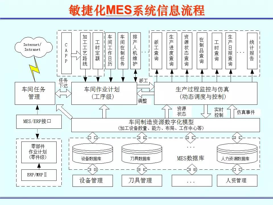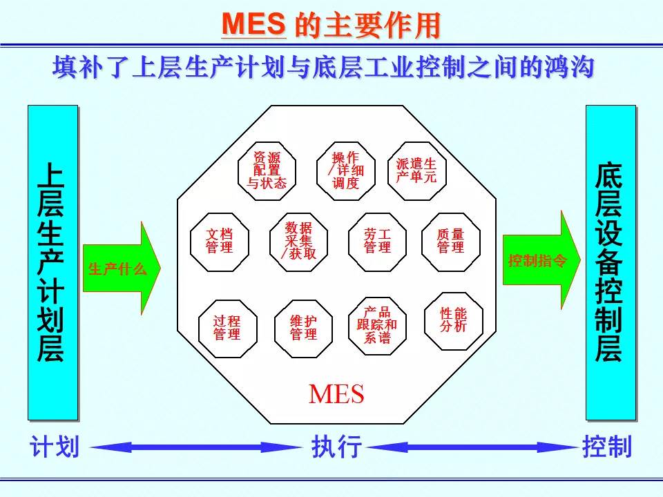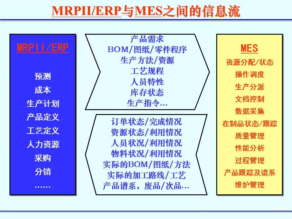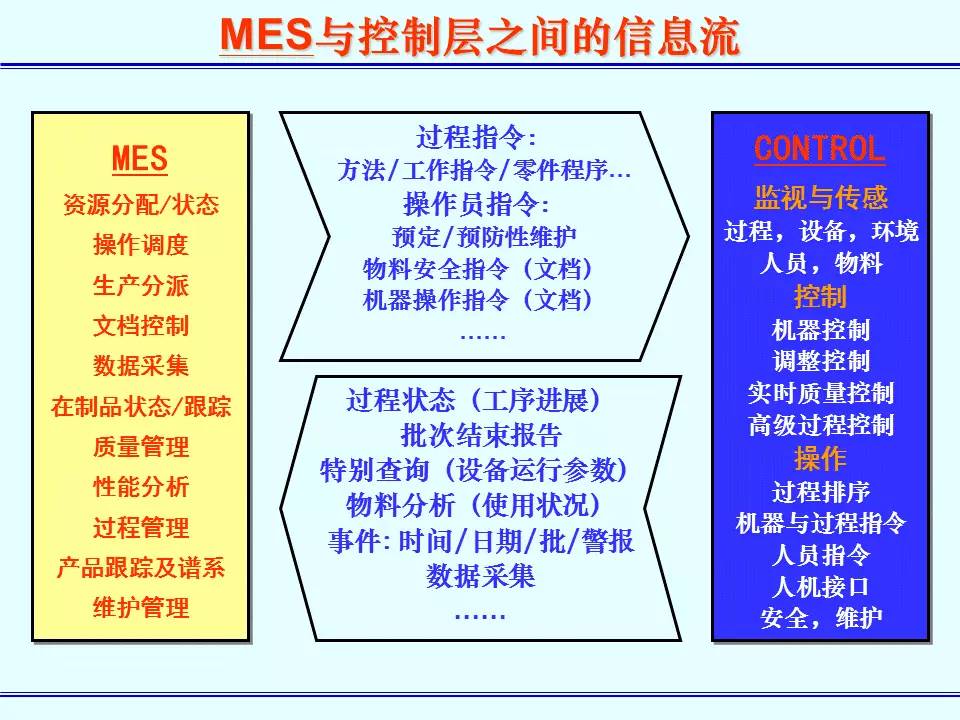 MES能通过信息传递对从订单下达到产品完成的整个生产过程进行优化管理。当工厂发生实时事件时,MES能对此及时做出反应、报告,并用当前的准确数据对它们进行指导和处理。