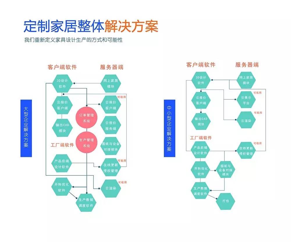 近年来,公司重点为家居企业提供互联网+和工业4.0智能制造整体解决方案,已率先开发成功从前端设计、渲染到后端生产一体化系统。并已在众多定制家居著名品牌(如好莱客、顾家家居、富安娜.美家、展志天华、亚丹衣柜等)及大量中小定制企业得到成功运用。