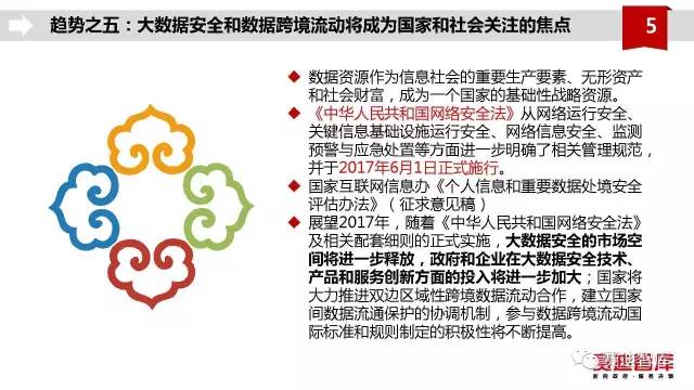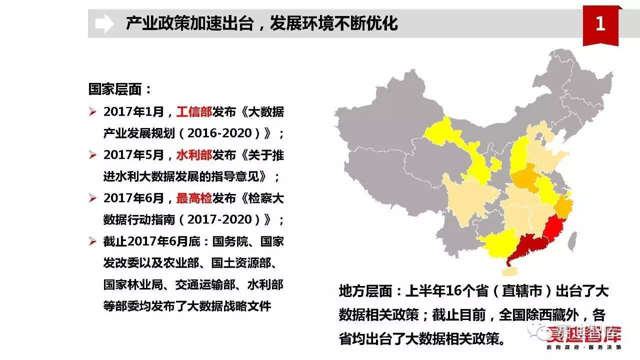 2017年上半年,大数据产业政策继续加速出台,政府数据开放共享取得突破,大数据学科建设以及国家工程实验室建设不断深入,创新体系不断完善。展望下半年,随着《促进大数据发展行动纲要》、《大数据产业发展规划(2016-2020年)》等政策落地实施,以及大数据交易、开放共享、跨境流通等领域标准规范的制定,产业发展环境将继续优化。继国家大数据综合试验区之后,结合地方产业发展和应用特色的国家大数据产业集聚区认定工作将启动,大数据产业将形成特色化集聚发展格局。大数据与人工智能、云计算、物联网等的融合将更加深入,新模式、新业态将不断涌现。同时,我国将持续深化大数据技术在工业领域的应用,探索建立工业大数据中心,实施工业大数据应用示范工程,工业大数据对智能制造的赋能效应将进一步释放。此外,随着《中华人民共和国网络安全法》、《个人信息和重要数据出境安全评估办法》的出台和实施,大数据安全和数据跨境流动将成为国家和社会关注的焦点。