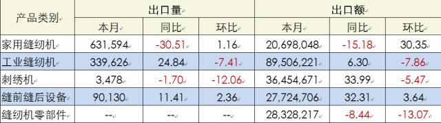 1-6月,国内累计出口缝制机械产品10.77亿美元,同比下降0.47%;其中,工业缝纫机累计出口184.70万台,同比增长12.54%,累计出口额4.94亿美元,同比增长2.69%;家用缝纫机(含手动缝纫器)累计出口322.85万台,同比减少14.40%,累计出口额9796.72万美元,同比下降23.22%;刺绣机累计出口2.22万台,同比减少6.09%,累计出口额1.80亿美元,同比下降4.59%。
