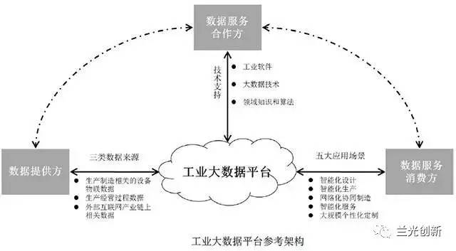 工业大数据平台涵盖了IT网络架构和云计算基础架构等基础设施,专家库、知识库、业务需求库等资源,及安全、隐私等管理功能。此外,还包含关联工业大数据实际应用的三方面角色,即数据提供方、数据服务消费方、数据服务合作方。