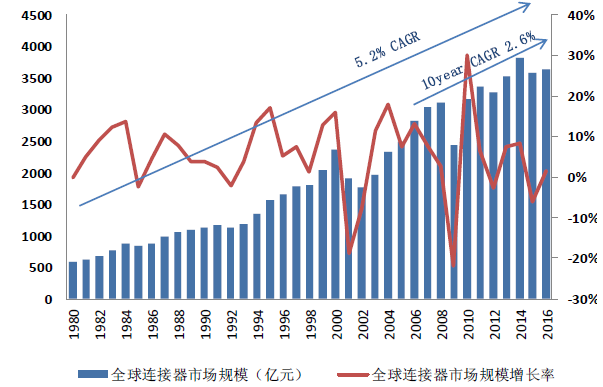 这是因为全球连接器市场已经连续近40年来持续增长,据Bishop&Associate数据,全球连接器市场从1980年的594亿元增长到2016年的3643亿元,复合增长率高达5.2%,近十年来增速放缓,复合增长率为2.6%。