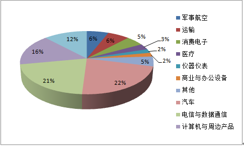 根据统计,汽车市场应用是全球连接器最大的应用市长,占比达到22.2%。其次是电信与数据通信,约有21%,另外计算机与工业分别占比达到16%、12%。