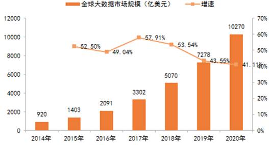 2015 年,全球大数据产业市场规模为1403 亿美元,预计到2020 年将达到10270 亿美元,2014-2020 年间 CAGR 高达 49%;