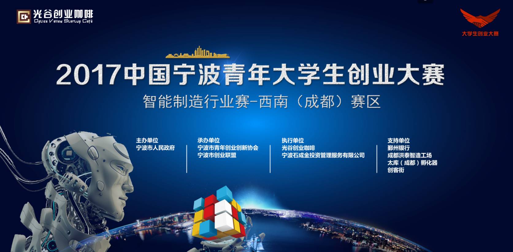 2017年7月31日下午两点,2017中国(宁波)青年大学生创业大赛,智能制造行业赛-西南(成都)赛区,在成都市青羊光谷创业咖啡活动大厅举行,15支优秀创业项目展开巅峰对决。本次大赛由宁波市人民政府主办,由宁波市青年创业创新协会、宁波市创业联盟联合承办。由光谷创业咖啡、宁波石成金投资管理服务有限公司执行承办,另有鄞州银行、成都洪泰智造工场、太库(成都)孵化器、创客街等单位大力支持。