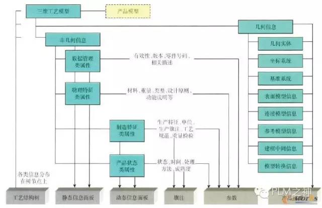 工艺模型中的信息一部分来自于产品模型,一部分来自于企业已有的制造资源数据库,还有一部分是为支持工艺技术表述而创建的,但这些信息与产品模型都有数据衍生联系,并且这些信息之间也相互关联。每个三维工艺模型的信息体系定义一个产品或产品部件。产品界面零件被用来构建各设计零件的关联关系。为了支持后续工作,三维工艺模型包含的内容可分为工程描述类内容(产品几何模型和PMI信息)、管理类内容(标识和构型)和工艺类内容。其中,工艺类内容需要根据制造企业具体能力进一步细化,这些内容需要从产品设计模型中继承、转化和衍生。产品模型成为工艺模型的唯一数据源头。