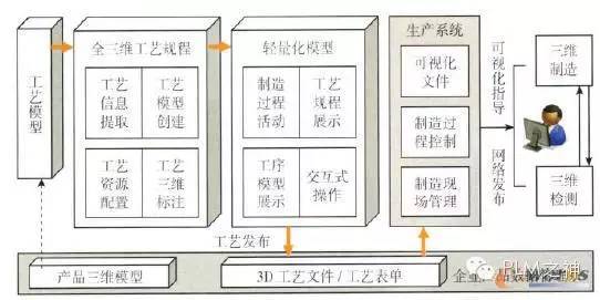 三维产品制造信息的发布主要有两方面内容:一个是工艺模型的输出,另一个是工艺表单的输出。根据企业数字化制造的软硬件环境条件,有些工艺模型需要轻量化处理,有些不需要,如对于装配工艺模型,生产中只需要可视化模型的相互关系,表示工艺BOM的结构状况,零件之间的安装关系,连接件数量和形式即可,但它的实体模型比较大,计算机处理速度较慢,可以轻量化处理。对于零件工艺模型,生产中需要看到又比较小,也可以直接发布到生产现场。在制造企业内一般需要将三维工艺设计系统与制造执行系统、产品数据管理系统和业务过程管理系统等集成,整个过程中的3D工艺文件,工艺表单一般发布于企业PDM系统中,再由PDM系统向生产系统提供支持(图5)。