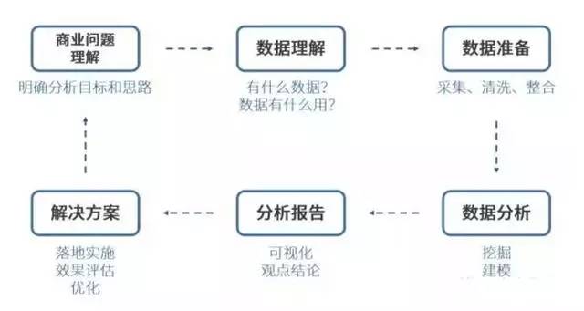 一个完整的大数据分析流程包含了商业问题理解、数据理解、数据准备、数据分析、产出分析报告、提出解决方案6个环节,并且是一个闭环、不断优化的过程。简化来讲就是分析什么问题,需要哪些出具,要做哪些数据处理,得出结论并落地实施。对于企业,可能不需要掌握高难度的分析处理能力,但是掌握数据分析思路、培养数据化管理的方式是非常重要的。