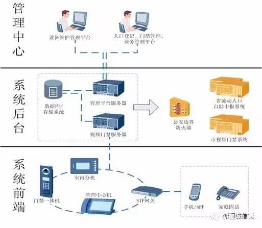 系统采用两级分布式计算机监控管理系统,由前端门禁终端和后端服务中心组成;后端服务中心统一对前端的智能门禁进行管理,人员信息、出入轨迹数据实时上传公安网。
