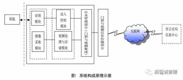 系统主要由钥匙(二代身份证、居住证、感应卡等)、识别模块(读卡器等)、出入控制模块(门禁控制设备)、图像采集模块、视频处理与存储模块、中央管理部分(含门禁与视频集成平台)、门禁与视频信息传输部分(含数据采集传输软件)组成,如图1所示。