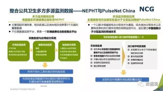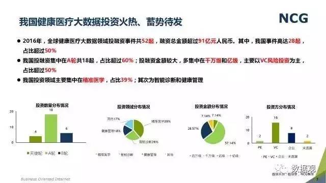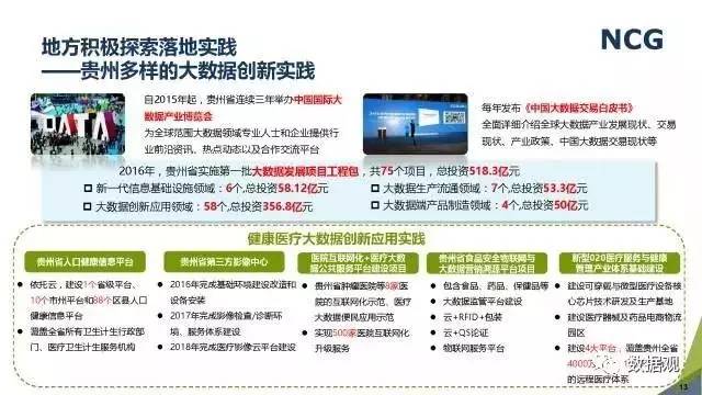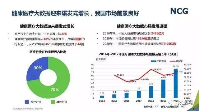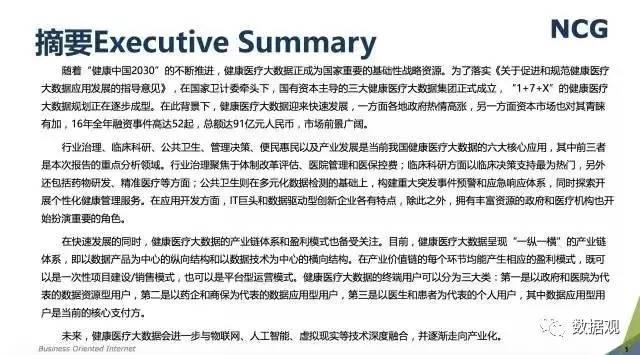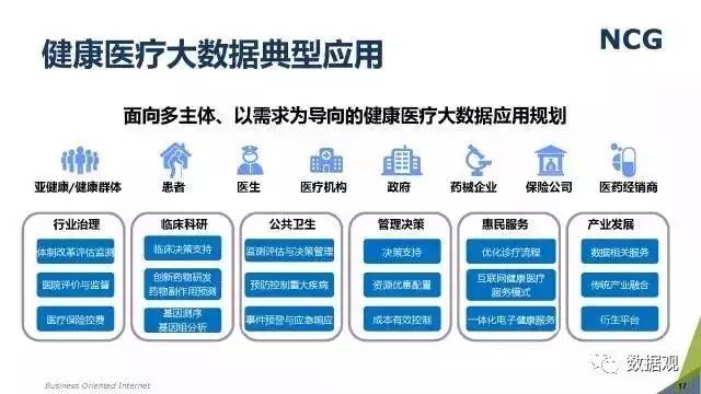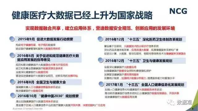 随着“健康中国2030”的不断推进,健康医疗大数据正成为国家重要的基础性战略资源。在国家卫计委牵头下,国有资本主导的三大健康医疗大数据集团正式成立,“1+7+X”的健康医疗大数据规划正在逐步成型。在此背景下,健康医疗大数据迎来快速发展,NCG在此基础上形成了对健康医疗大数据产业分析展望的行业报告。