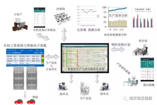 在于基于RFID的数据采集和相应的领域知识,解决了服装制造过程中生产、后道整理和全智能仓储系统的部分问题,企业内部物流从原料(面、辅料)? 裁剪 ? 缝制 ? 后道 ?仓储全流程的物料跟踪与管理,并与吊挂生产线连接,形成从生产到入库的完整解决方案。传感技术和RFID技术支撑制造业各个环节的精确数据采集,各种有线、无线通讯技术保证数据流的畅通,实时数据处理技术进一步保证数据的时效性,由此形成的工业物联网可以提供企业生产管理和决策所需的各种准确、有效的数据。运用“大数据、云计算、智能化”,创新生产组织方式,打造了大数据支撑下的纺织服装柔性生产平台。该平台基于三维信息化模型,以订单信息流为核心线索,在组织节点进行工艺分解和任务分解,并以基于物联网技术的数据传感器,持续不断地收集任务完成状况,反馈至中央决策系统及电子商务系统,通过全程数据驱动,传统生产线与信息化深度融合,实现多品种、小批量、个性化定制的大规模生产。2、服装柔性生产“无缝转款”是关键
