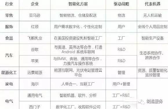 如下表选取的7个行业,9家领先公司作为案例,列举了智能制造5种驱动战略相应的执行方案,以及所代表的创新和投资关注方向。