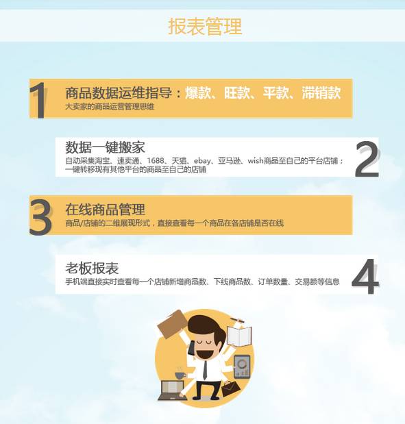 马帮ERP作为旗下的主打产品,马帮ERP3.0以SaaS切入,服务出口跨境卖家,帮卖家接入海外电商平台、优化产品选择、降低物流成本、扩展销售渠道。马帮ERP利用与全球电商平台的对接,帮助跨境电商商家实现一站式、跨平台、多店铺的管理,更致力于打造高效的管理方法和解决方案。