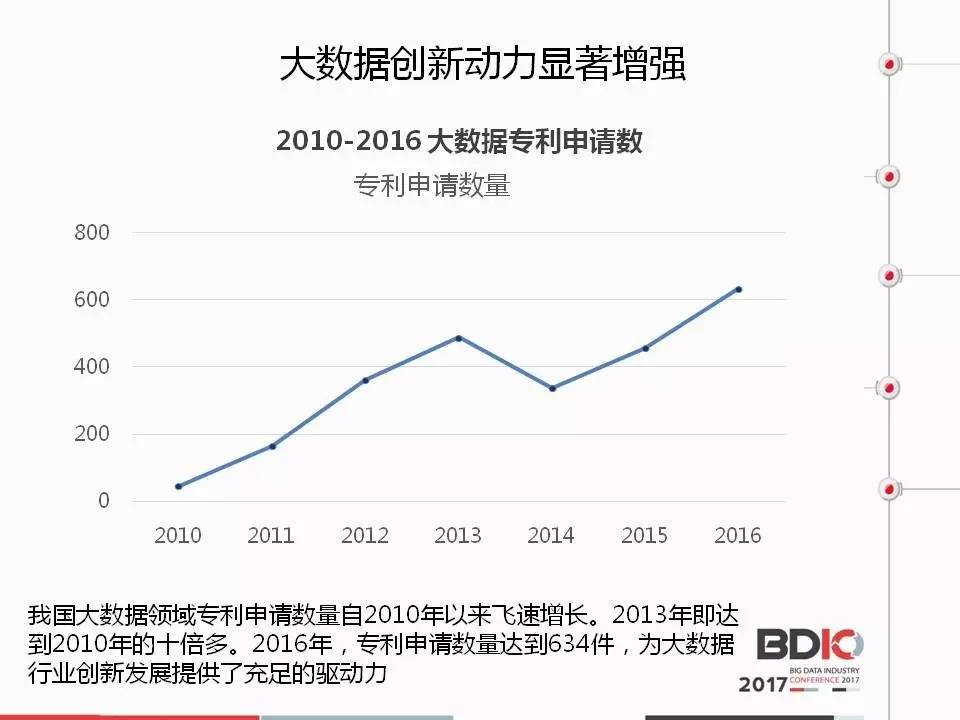 我国大数据领域专利申请数量自2010年以来飞速增长。2013年即达到2010年的十倍多。2016年,专利申请数量达到634件。