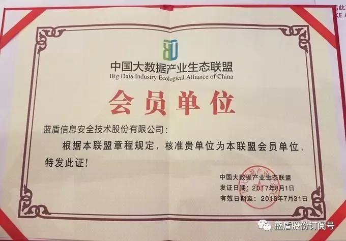 大会签署了中国大数据人才培养联合倡议书,揭晓2017大数据发展五星城市,并为中国大数据产业生态联盟专家、理事会员单位颁发证书。蓝盾股份成为中国大数据产业生态联盟会员单位,接受了中国大数据产业生态联盟颁发的证书。