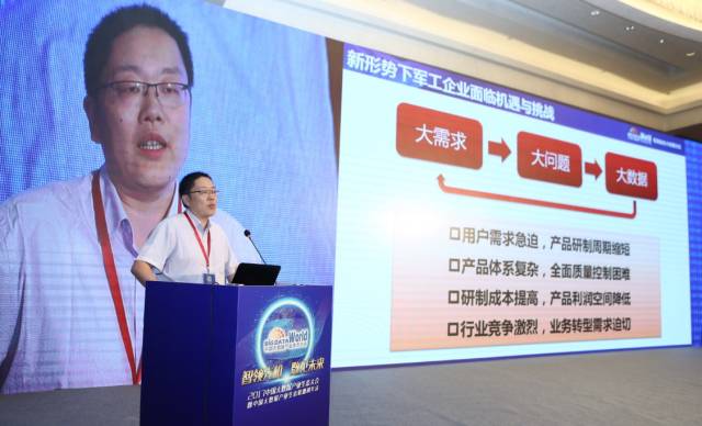 美林数据技术股份有限公司智能制造事业部副总经理于洋发表了工业大数据助力军民“数”融的主题演讲,对大数据条件下的智慧军工能力建设提出了独到的见解。在他看来,工业大数据的典型应用模式包括:基于产品的研发知识挖掘、数据驱动的加工工艺优化、集成可视的生产管控建设。