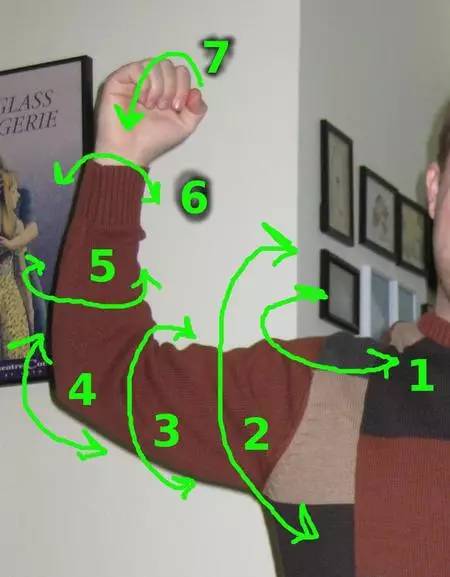 有人问5,6是不是一样的。5是拧钥匙时唯一要转动的关节,动力来自小臂两根桡骨的扭转;6是把鼠标放在桌面用手转时唯一要转动的关节,动力来自手腕的旋转。