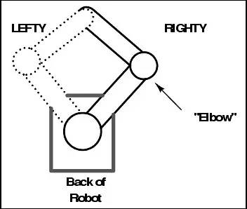 请问我们能够把机器人在保持上部末端机构在平面上位置不变的情况下,从“lefty”这个状态扭到“righty”这个状态吗?答案是不行的,不管怎么动两个关节,移动过程中末端机构的位置肯定是要变的。看官也可以拿两根笔在桌子上动一动试试。同样地,一个6自由度的机械手,即使某两组构型对应的末端机构的三维位置相同,机械手在从一个构型移动到另一个构型的时候无法保持末端机构始终不动。如果有人在电视里看过工业机器人焊东西的话,就会发现它在同一个位置焊接的时候,一会儿整个扭到这边,一会儿整个扭到那边,看起来非常酷炫的样子。