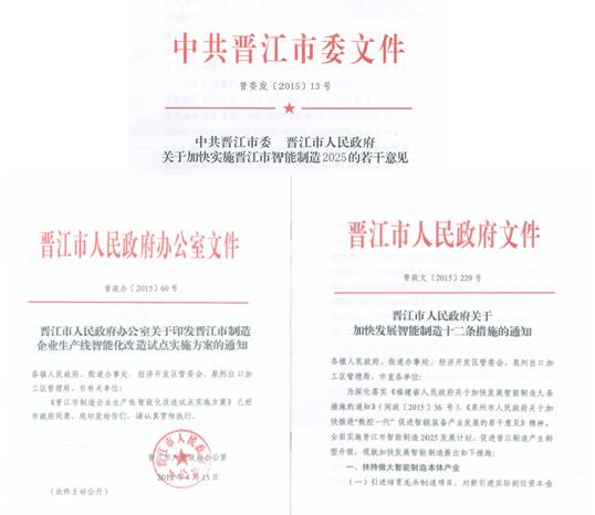 作为泉州传统制造业的主要聚集地,对接智能制造,践行“晋江经验”,助力传统实体经济转型升级,晋江企业“智造”成为关键点。近年来,晋江市深入贯彻各级文件精神,紧抓发展机遇,坚持把发展智能制造作为加快制造业转型升级的主攻方向,从政策扶持、产业培育、应用推广、人才支撑、融资保障等方面着手推进,取得了良好成效,2015年获评全省首批省级智能制造试点示范基地。