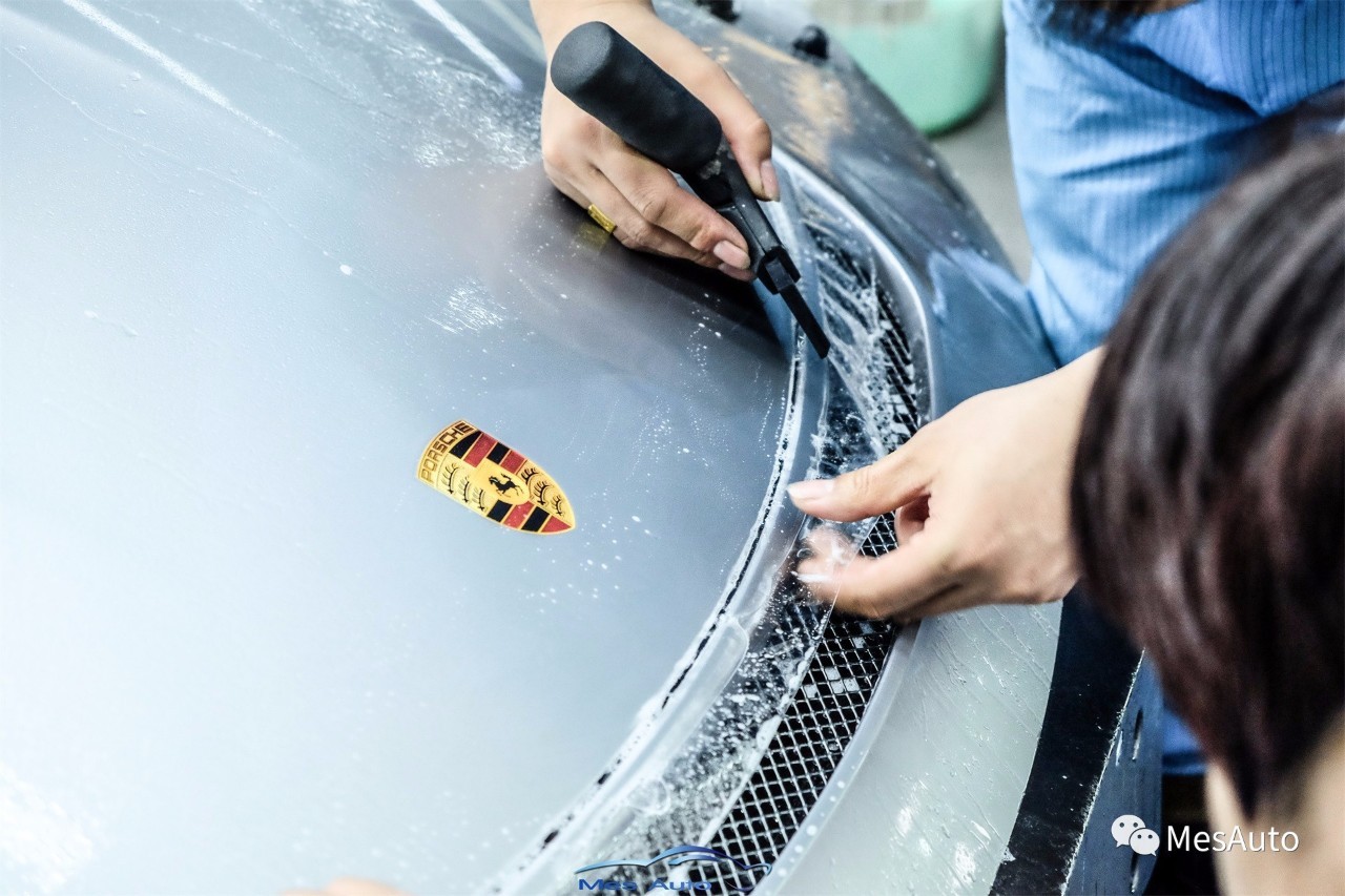 台上一分钟,台下十年功,GT3 RS 的弧度与面积较大,需要专业的贴膜技师才能够完美上装隐形车衣。