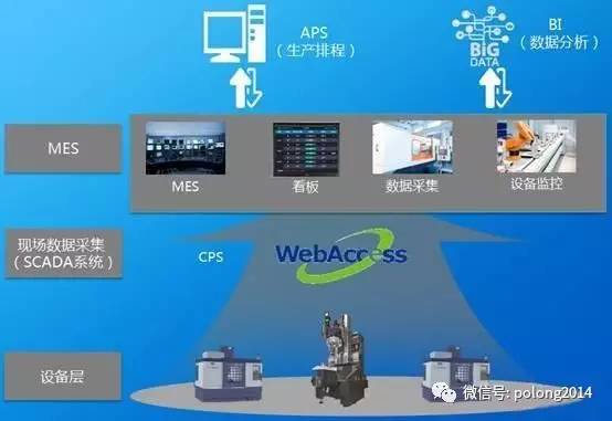金蝶 “智能制造”完整解决方案分为4个层级,在底层是传感、执行、控制器等的管理,第二层是金蝶设备联网平台,包括PLC、DCS、HMI、SCADA等,上面两层分别是基于金蝶K/3WISE的APS、MES、WEM以及ERP。