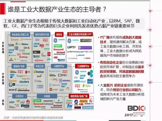 工业大数据产业生态根植于传统大数据和工业自动化产业,以IBM、SAP、微软、GE、西门子等为代表的巨头企业利用先发者优势占据产业链重要环节。