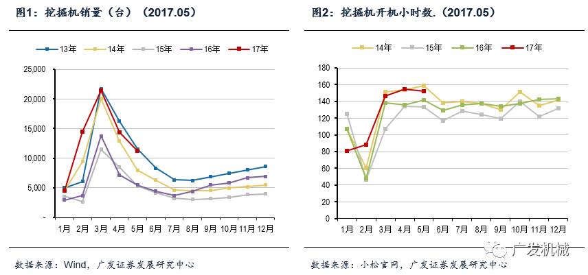 数据追踪:5月挖机销量11,271台,同比增长105.64%。2017年1-5月挖机累计销量66135台(去年全年销量为70320台),累计同比增长100.5%;5月挖机平均开机小时数为151.8小时,同比增长7.20%。1-5月累计开工小时620.8小时,同比增长8.72%。
