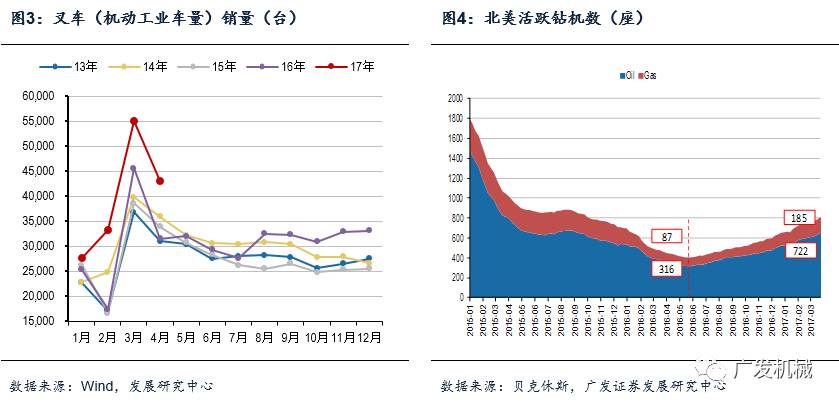 数据追踪:4月叉车销量42,970台,同比增长36.64%,是近5年来当月销量最高值,同比增速也较上月有所增加;2017年1-3月叉车累计销量115,979台,同比增长31.5%;截止5月26日,北美活跃钻机数907台,其中石油钻机722台,北美活跃钻机数自从2016年5月的历史低点已持续反弹12个月。