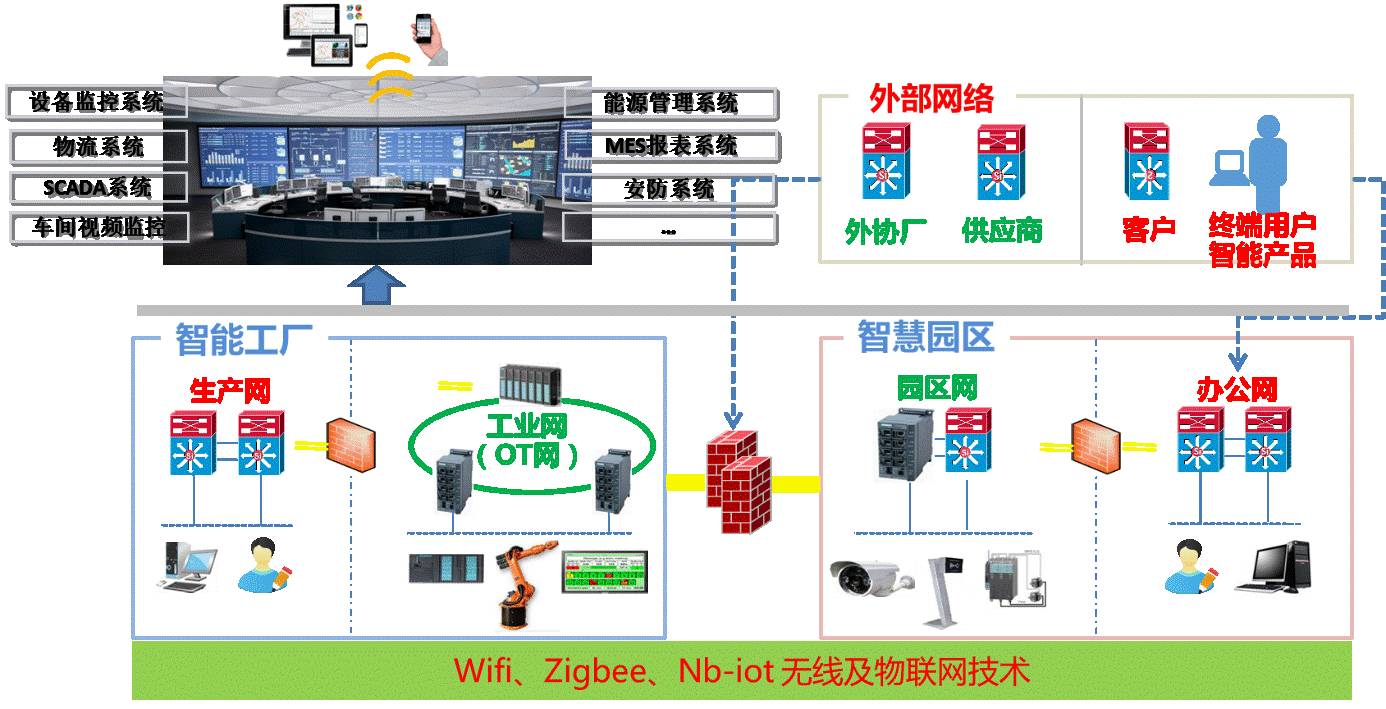 核心设计拟采用软件定义,依据不同功能、安全等级分区。实现内外打通、OT网隔离。园区网以WIFI和NB-IOT为主,实现人物互联为主;工厂网主要实现物物互联为主;外部用户以映射隔离、身份识别,辅以EDI系统,实现协作集成。架构(如图2)示: