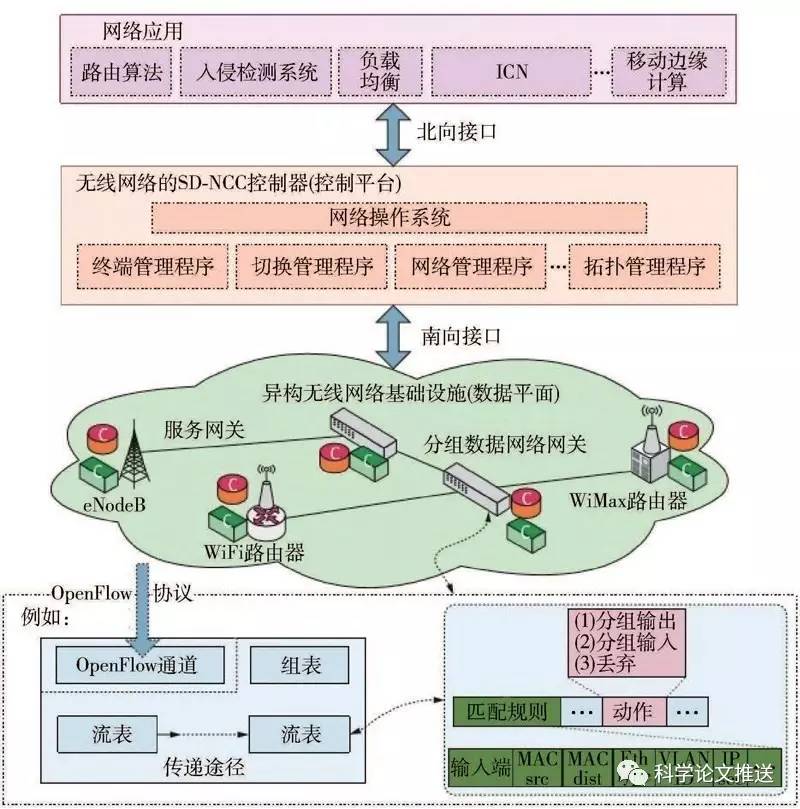 Huo等[38]以无线网络为例, 为每个网络节点配备存储和计算能力,对SD-NCC架构及其实现进行了详细的阐述. 如图2所示,网络中存在一个逻辑的控制平面, 网络中的应用将能耗、服务质量等具体需求通过北向接口发送到控制平面, 控制器根据需求对数据平面的规则、动作进行设计,将应用需求转换为对底层设备资源的需求; 控制平面也具备监测能力, 能够通过终端、交换、网络、拓扑等系统管理程序将物理设施抽象为虚拟资源切片,并按照上层应用的需求进行资源切片的动态调度; 同时, 控制器还通过南向接口, 将通信、计算、接入、存储等指令下发到数据平面的流表中,实现底层设备的动态管控.