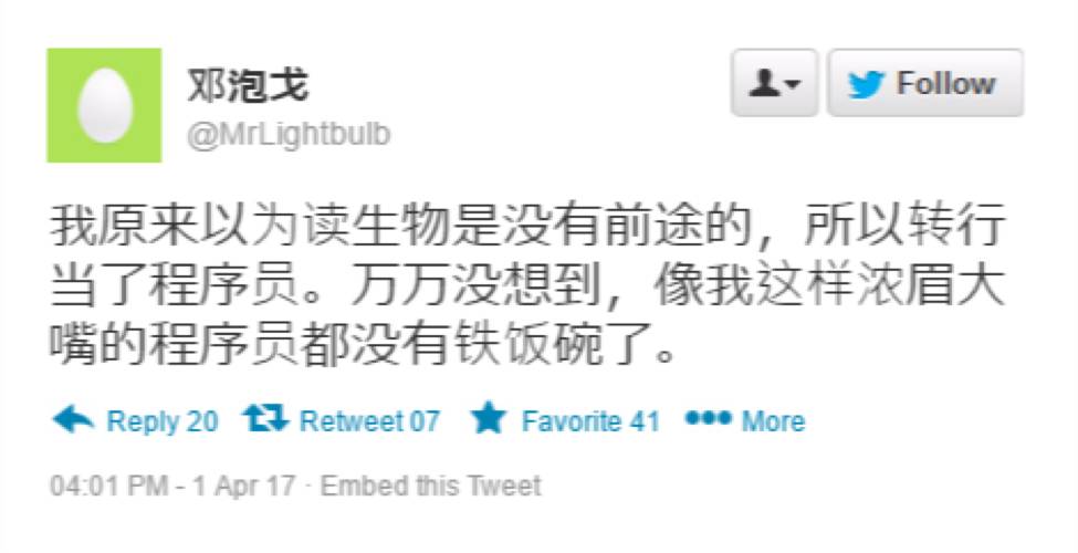 程序员立马嗅到了危机。“我原来以为读生物是没有前途的,所以转行当了程序员,”硅谷著名生物转行标兵邓泡戈先生在推特上说:“万万没想到,像我这样浓眉大嘴的程序员都没有铁饭碗了。”