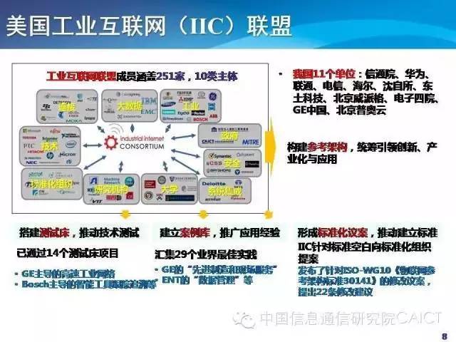 美国工业互联网联盟组织目前进展非常快,成员涵盖251家,涵盖了十大类型,有大数据企业,工业企业,系统集成企业等。40%多是美国,但德国、亚太的企业也在纷纷加入IIC,发展非常快。美国工业互联网联盟的目标是提出参考架构,在此基础上引领标准的制定和相关的研发。中国已经有11个单位加入和组织活动。美国工业互联网联盟组织梳理的核心工作,一个是测试床,进展非常快,待通过的20多个,已经通过的15个左右。另外也征集了很多的案例,提炼共性的需求,展示业界具体的经验。IIC已经和70来个组织建立了关系,希望能够深化标准组织的影响力,把IIC的成果反映到标准组织里面去,开展标准化的工作。