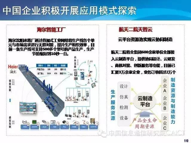 中国企业在工业互联网方面做了很多探索,包括海尔智能工厂,航天二院天智云。海尔在沈阳的冰箱厂一个产品线能够支持500多个型号的产品生产,在各个维度都有快速的对产品线的调配。航天二院之天智云发展非常快,包括协同生产服务和制造资源相关的企业搭建一个大的平台,提供协同的设计研发和商业方面的对接,现在已经汇聚了30多个企业。