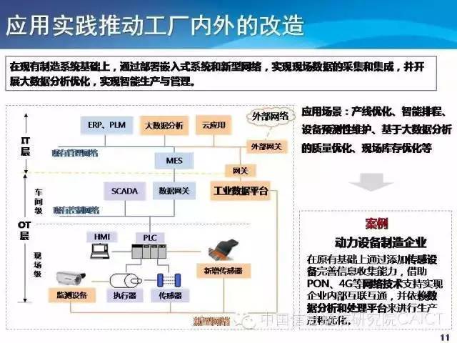 应用实践推动工厂内外的改造。从生产系统改造来看,灰色是现有生产制造的产线和控制系统,很难改造,企业普遍的做法是在设备上叠加一些传感器,这样能把数据采集上来,汇聚到工业数据平台上进行大数据的分析和应用。