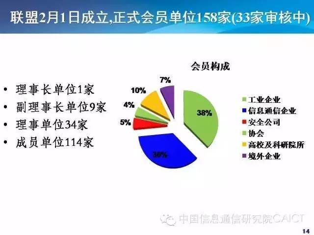 成员发展非常快,刚成立时143家,现在正式会员158家,还有很多在提出申请。中国信息通信研究院是理事长单位,还有9家副理事长单位,34家理事单位。来自工业企业和信息通讯企业会员的数量是持平的,都是30%多,一个36%,一个38%。我们希望工业互联网产业联盟能成为全球化的联盟,也有境外的企业参与。