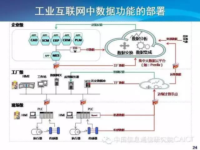 工厂部署环节图。将来工厂内部有两个层面,一个是在工厂下面形成一个闭环,将来边缘计算的能力是很关键的。另外,很多数据能够上到企业级的数据平台上去,包括互联网的数据,包括生产环节的数据。最终通过数据的分析实现对生产经营的决策和反馈控制。从这张图上可以看到将来数据对信息系统的演进和对外连接也会有很大的影响和推动作用。