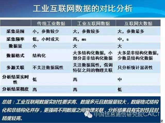 对工业互联网与传统的工业数据和互联网数据进行对比,包括范围、采集的频率、数据量、格式、关联性、实时性的要求。整体来看,工业互联网实时性的要求更高,特别是在生产制造环节。工业互联网的数据量非常大,数据的结构是并存的,实时性比较突出。